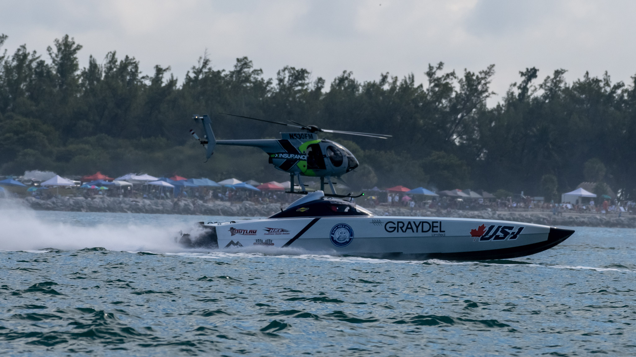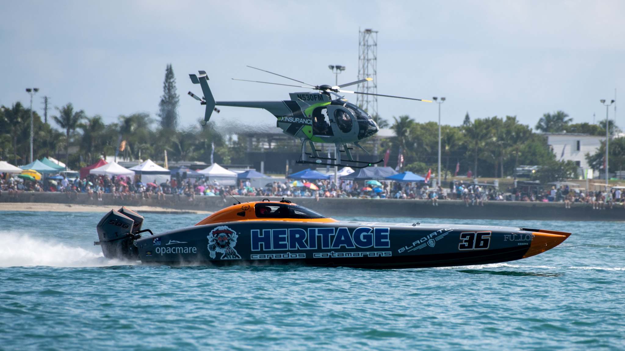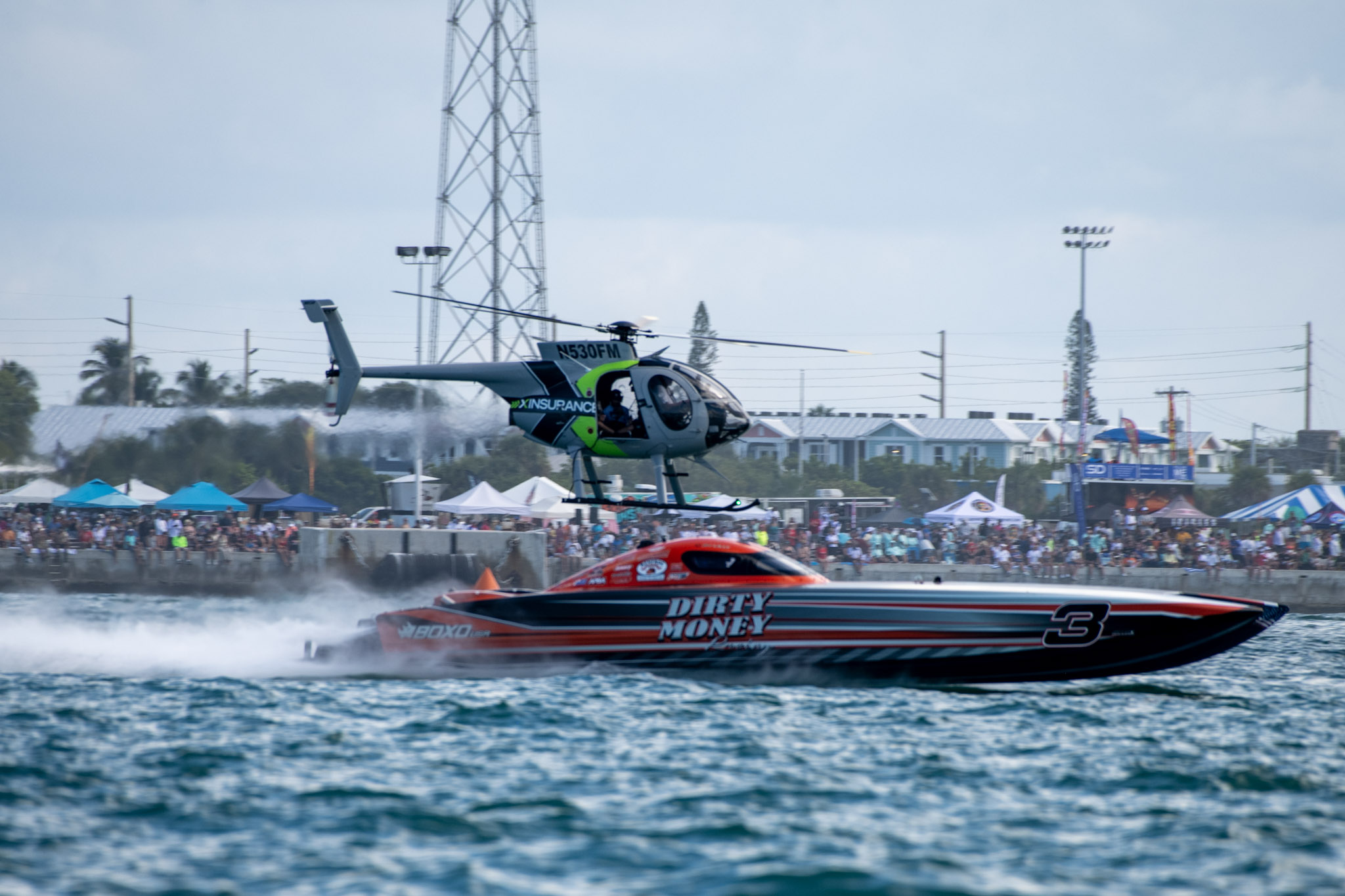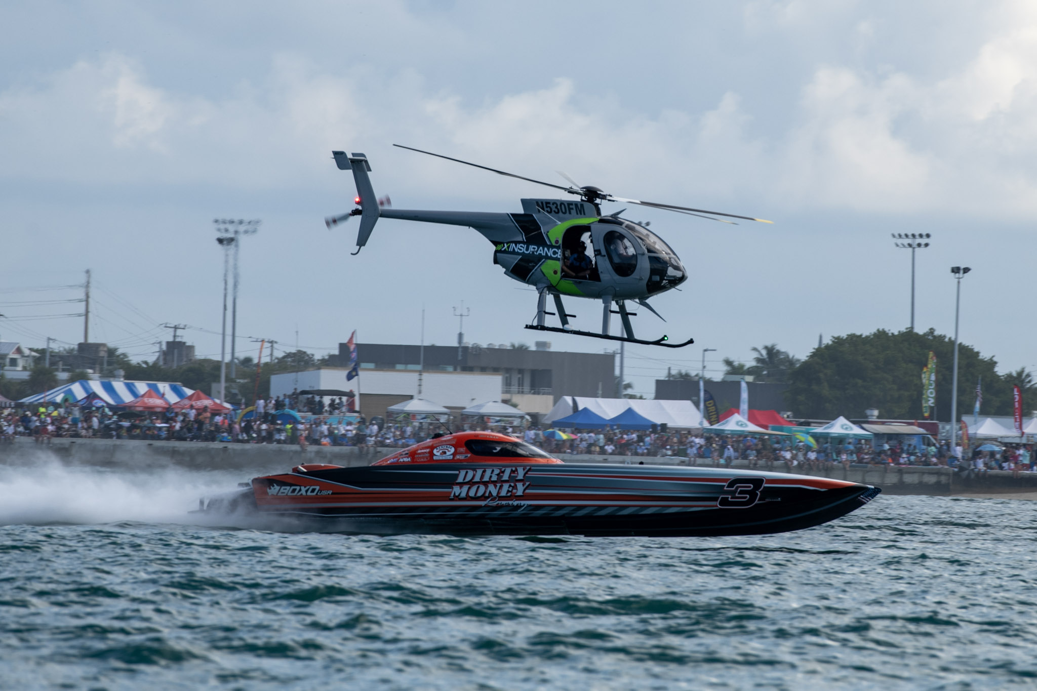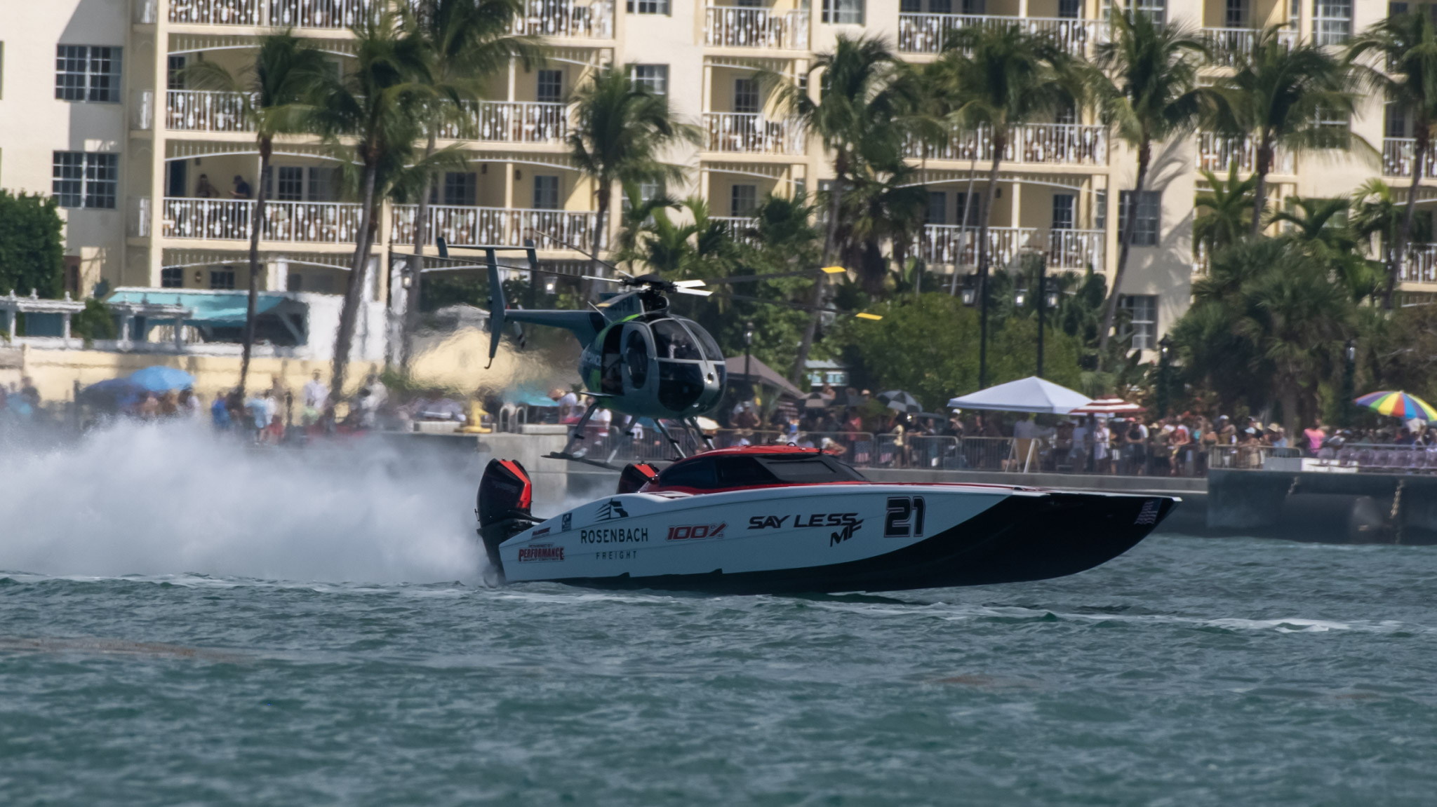 Supercharged catamarans tearing across turquoise water at 180 mph, helicopters banking inches above the spray, and rooster tails erupting like geysers — the World Championship offshore powerboat races in Key West, Florida. These images capture the raw violence and precision of the fastest boats on water, frozen at shutter speeds that reveal details invisible to the spectators lining the shore.